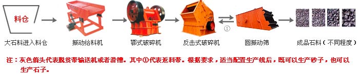大塊石料經(jīng)料倉由振動給料機(jī)均勻地送進(jìn)鄂式破碎機(jī)進(jìn)行粗碎,粗碎后的石料由皮帶輸送機(jī)送到反擊式破碎機(jī)進(jìn)行進(jìn)一步破碎;細(xì)碎后的石料由皮帶輸送機(jī)送進(jìn)振動篩進(jìn)行篩分,篩分出幾種不同規(guī)格的石子,滿足粒度要求的石子由成品皮帶輸送機(jī)送往成品料堆;不滿足粒度要求的石子由皮帶輸送機(jī)返料送到反擊式破碎機(jī)進(jìn)行再次破碎,形成閉路多次循環(huán)。