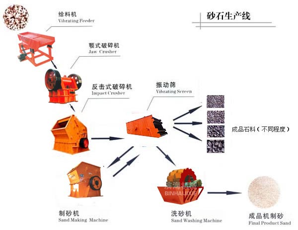 石料由振動給料機均勻地送到顎式破碎機進行粗破,粗破后的物料由膠帶輸送機送入到制砂機進行進一步破碎,細碎后的物料被輸送到振動篩進行篩分,達到成品粒度要求的物料被送入洗砂機清洗,清洗后由成品輸送帶輸出即為成品;未達到成品粒度要求的物料從振動篩返回制砂機重新加工,形成閉路多次循環。成品粒度可按用戶的需求進行組合和分級。如果選用干法生產工藝,可配備粗細粉分離機和除塵設備。
