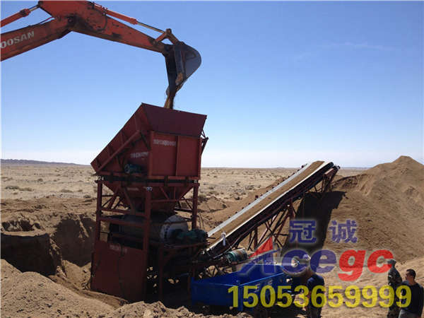 特種干選機采用挖掘機上料,廢料用輸送桿輸送走,使用于3米左右沙層,上料高度為4.5米,裝載機可以直接上料不用助坡。整機用電量為45kw左右。小時免費咨詢電話:400 9949 111 手機:15053659999 15653473333